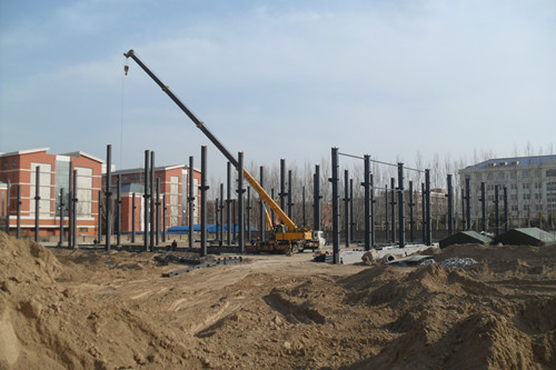 3、汽车学院教学厂房屋架吊装施工进行中﹙见下图﹚;