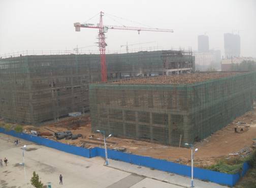 五层主体完成,六层主体绑钢筋、支模板进行中