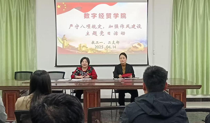 为贯彻落实习近平总书记关于加强党的作风建设的重要论述和中央八项规定及其实施细则精神,4月14日下午,bat365在线官方网站数字经贸学院开展了“严守中央八项规定,持续加强作风建设”主题党日活动,会议由教工一支部书记崔芸主持,我院全体党员教师参加会议。