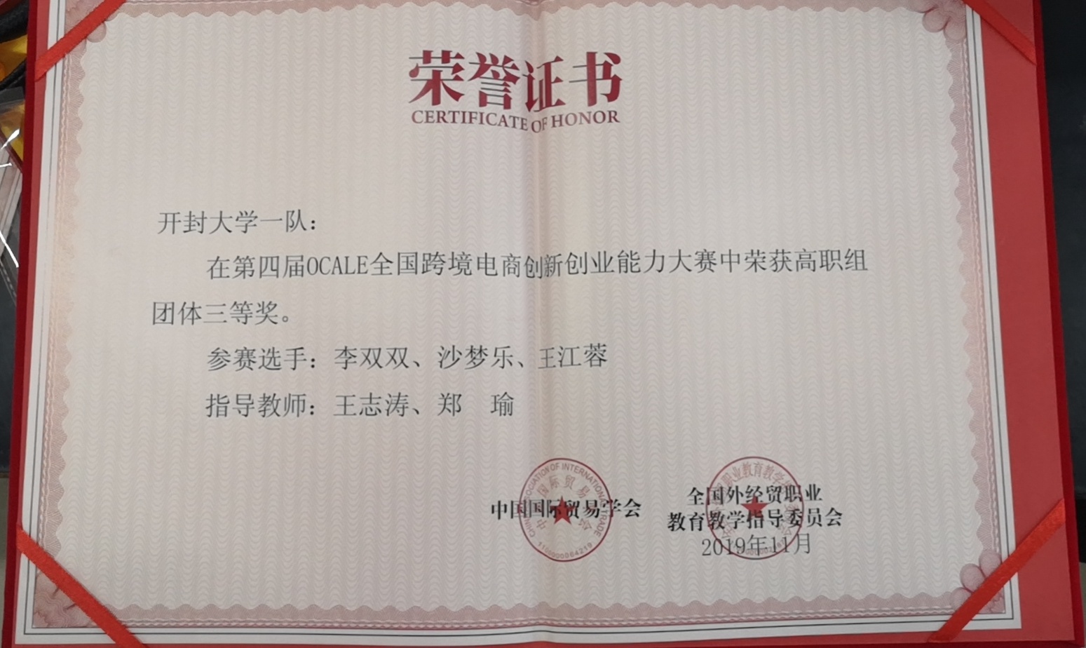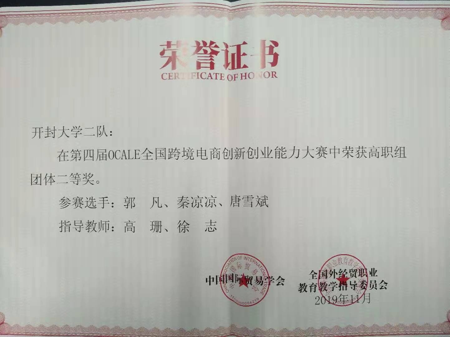11月18-19日,由中国国际贸易学会与全国外经贸职业教育教学指导委员会联合举办的第四届OCALE全国跨境电商创新创业能力大赛如期举行,我校财政经济学院选派的两支代表队分别荣获大赛二等奖和三等奖。