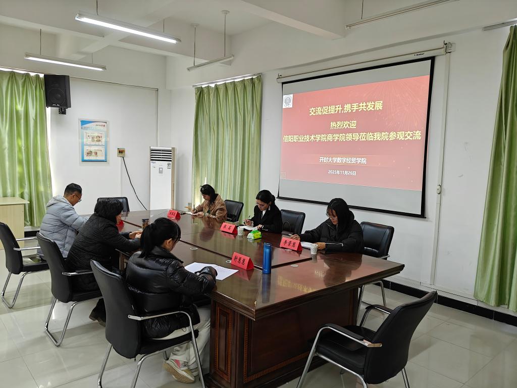 11月26日下午,信阳职业技术学院商学院电子商务专业负责人张茜、电商直播专业教师黄馨毅、李景慧一行三人来到我院开展交流活动,院长尤影、现代物流管理专业教研室主任轩慧慧、电子商务专业教研室主任孙航热情接待并参与座谈。