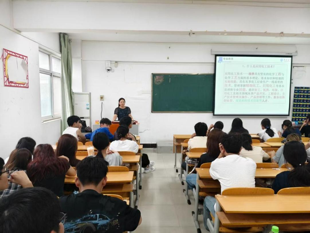 9月11日上午,材料与化学工程学院在3号楼204教室举行2025级应用化工技术专业新生欢迎会曁专业教育。应用化工技术专业教研室主任刘双枝教授和世界职业院校技能大赛全国总决赛化工技术赛道金牌教练胡海霞老师参加专业教育活动。