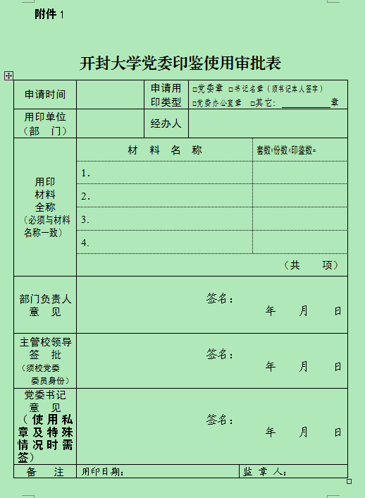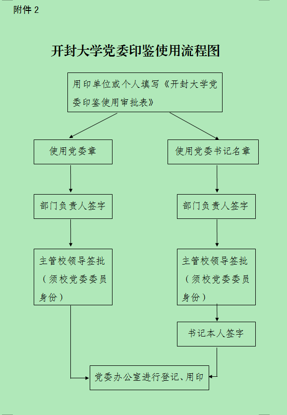 5.其他特殊用印者,经党委办公室主任审核,部门负责人及主管校领导(校党委委员身份)签字后使用。
