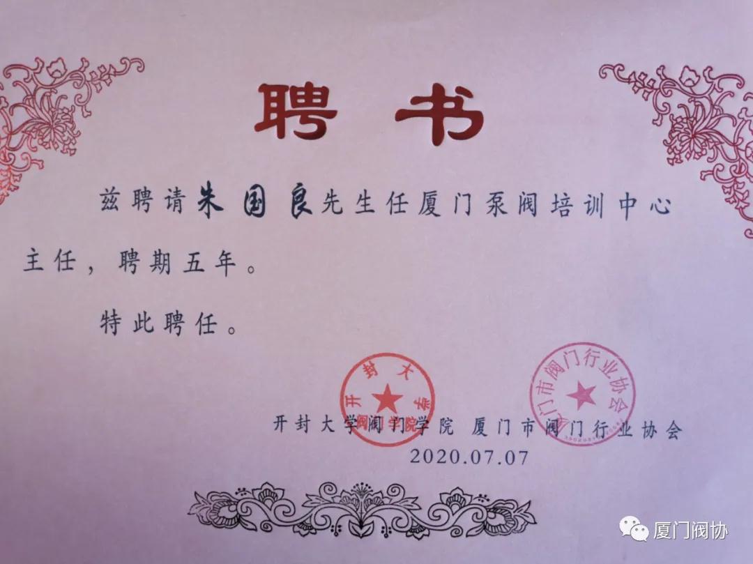 bat365在线官方网站阀门学院副院长吕玉湖先生为厦门市阀门行业协会会长朱国良先生颁发“厦门泵阀培训中心”主任证书!