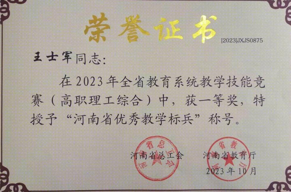 近日,河南省总工会、河南省教育厅联合下发《关于2023年河南省教学技能竞赛获奖情况的通报》(豫工文〔2023〕107号),对在竞赛中取得优异成绩的集体和个人进行表彰。我校土木建筑工程学院王士军老师荣获高职理工综合一等奖,被授予“河南省优秀教学标兵”称号;另一名老师荣获高职文科综合三等奖。