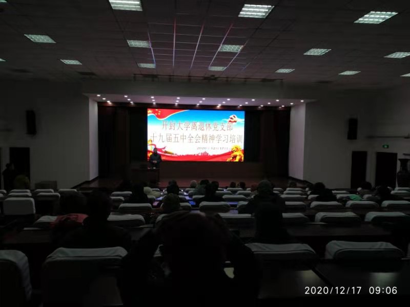2020年12月17日上午九点,我校离退休党总支三个支部在行政楼一楼报告厅召开“我为河山赋能助力”主题党日活动,邀请思政部卢慧勇老师为退休党员进行题为“擘画新蓝图 开启新征程”——党的十九届五中全会精神解读的专题报告,退休党员50余人参加了活动。
