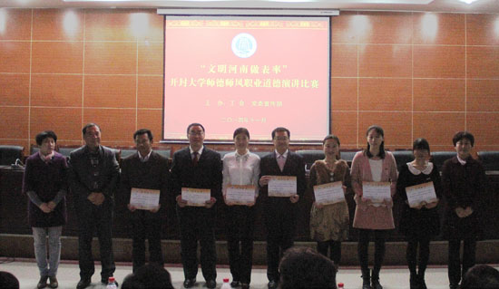 为进一步加强师德师风建设,推进我校党的群众路线实践教育活动深入开展,11月13日下午,我校在东京大道校区举行主题为“文明河南做表率”的师德师风职业道德演讲比赛。校领导储建新、赵辉、何世玲、成芳出席并观看比赛。全国优秀新闻工作者、河南省十佳优秀新闻工作者、开封电台主任播音员刘红,以及我校相关处室负责人曾小平、赵海胜、樊玉霞、吴玺玫、陈学雷、张焰担任比赛评委。