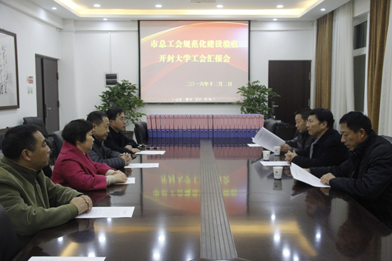 本站讯 12月2日下午,市总工会规范化建设验收专家组莅临我校对校工会规范化建设工作进行检查验收,汇报会在行政楼二楼会议室举行。工会主席成芳出席了汇报会,工会相关工作人员参加了汇报会。