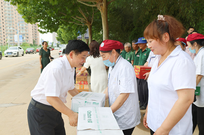 7月22日,我校开展了“夏送清凉”慰问暑期一线教职工活动,为在炎炎夏日中坚守岗位的教职工们送去了学校领导的关心和关爱,切实保障广大教职工的劳动健康权益。校党委书记谭贞、校长王德如及工会主席成芳等参加了活动。