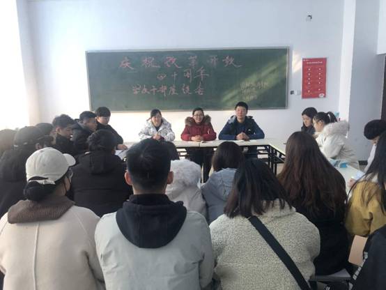 大会结束后,国际教育学院团总支书记刘青老师和学院全体辅导员老师,组织观看大会直播的学生干部召开了“庆祝改革开放40周年”学生干部座谈会。会上刘青老师结合习近平总书记讲话精神教导学生干部,“我们这么大的一个国家应该有雄心壮志”,作为祖国和民族发展先锋力量的青年学子更应该立大志、立壮志,接好在改革开放事业中做出突出贡献的先辈的接力棒,她鼓励与会的各位学生干部代表,要发挥学生干部的榜样示范作用,以“天行健,君子以自强不息”、“地势坤,君子以厚德载物”的变革和开放精神书写自己壮美的青春篇章。辅导员贺钰老师和胡蓓晖老师勉励同学们,要牢记习近平总书记“伟大梦想不是等来、喊来的,而是拼搏出来的、干出来的”号召,拿出抓铁有痕、踏石留印的韧劲,以钉子精神为指引踏实学习、努力拼搏创造更加辉煌的成绩。