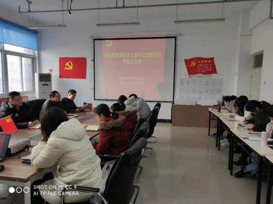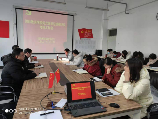 按照学校党委统一要求,并报经学校党委组织部同意,2021年1月7日下午,国际教育学院党总支召开了党组织书记抓基层党建述职评议考核工作会,会议由院党总支书记陈力同志主持,全院20名党员教师到场参加。会上,首先由教工支部书记蒋大山同志代表教工党支部做了述职,学生党支部书记刘青同志代表学生党支部做了述职,支部书记着重就基层党组织开展工作情况、落实意识形态工作责任制情况、发挥基层党组织战斗堡垒作用完成重大任务情况、落实全面从严治党目标责任情况等几个方面谈特色、查问题、剖根源。其次,院党总支书记陈力同志逐一对述职人进行了点评,指出了支部存在的问题和努力的方向,其他委员也分别结合工作分工进行了点评。最后,由全体总支委员对述职人进行测评评议,按“好、较好、一般、较差”4个档次逐一做出了评价。