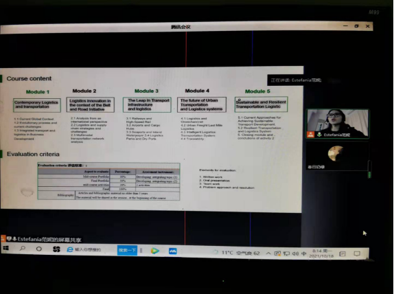 本门课程由格林威治大学Estefania  Lopez教授在腾讯课堂进行为期两星期的线上直播授课,将从Contemporary Logistics and Transportation 、Logistics and Supply Chain Innovation in the Context of the Belt and Road Initiative、The Leap in Transport Infrastructure and Logistics、The Future of Urban Transportation and Logistics Systems、Sustainable and Resilient Logistics五个部分进行讲授,并对同学们进行过程性评价与考核。
