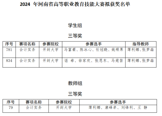 近日,河南省教育厅公示2024年河南省高等职业教育技能大赛拟获奖名单,我院大数据与会计专业师生荣获会计实务技能大赛三等奖3项,其中,学生组2项,教师组1项。