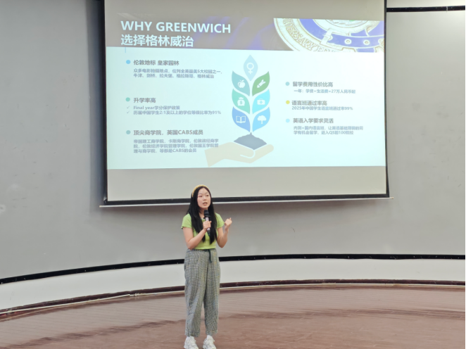 随后,英国格林威治大学代表团队带来专项宣讲与互动答疑。Conor Shanahan 先生从 “区位 - 学科 - 资源” 三维度详解校方优势。沈玥女士则聚焦学生关切,结合案例解读赴英留学的实际价值。在答疑环节,中英双方针对新生提出的 “留学申请时间节点”“雅思分层备考方案”“校内公寓与合作民宿选择”“PSW 签证申请流程及留英物流岗位分布” 等问题逐一拆解,Conor Shanahan 先生还特别分享了格林威治大学针对该专业学生的 “语言达标绿色通道”,为新生提供可落地的规划参考。