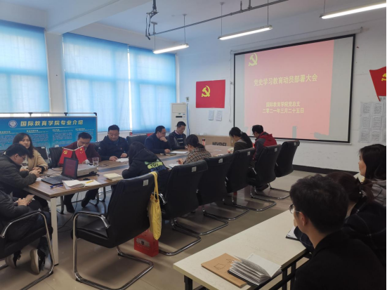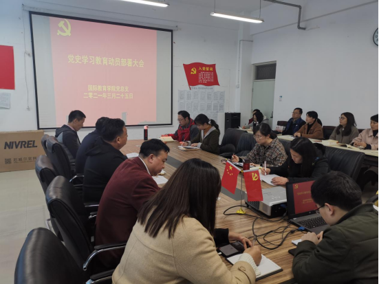 3月25日下午,国际教育学院党总支召开党史学习教育动员部署大会,全体党员参会。蒋大山同志首先宣读国际教育学院党总支党史学习教育实施方案,说明了党史学习内容、三个阶段学习进度安排以及多样化学习形式的要求。陈力同志传达了学校党史学习教育动员部署大会的精神,特别是陈灿书记对开展党史学习教育提出的三点意见:第一,弘扬优良传统,坚定政治自觉,深刻理解开展党史学习教育的重大意义。第二,汲取历史智慧,凝聚发展力量,不折不扣落实党史学习教育的重点任务。第三,加强组织领导,立足工作实际,高标准高质量推动党史学习教育扎实有序开展。最后要求所有党员同志要充分认识到学习党史的重要性,不折不扣落实党史学习任务,促进学院各项工作开展,为学校的“双高”建设和升本事业做出贡献。