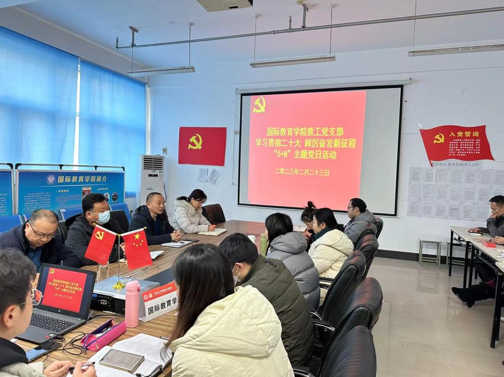2月23日下午,国际教育学院教工党支部开展了“学习贯彻二十大 踔厉奋发新征程”5+N主题党日活动,校党委委员、副校长李治同志及教工党支部全体党员参加会议,会议由教工党支部书记李充同志主持。