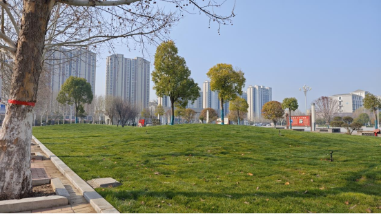 大观广场周边区域,将原有的老旧植被进行移除,保留长势较好的大乔木,场地重新整理,铺设草坪,打造疏林草地景观。