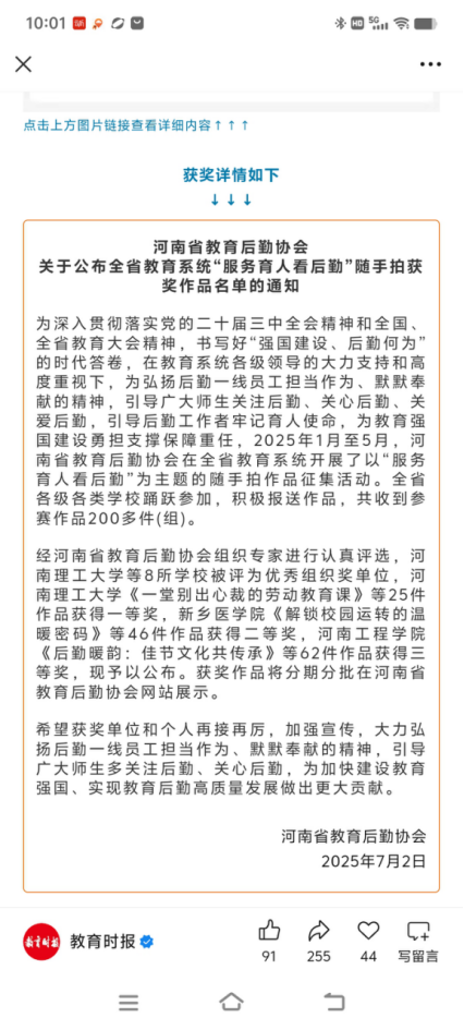 近日,河南省教育后勤协会公布了全省教育系统“服务育人看后勤”随手拍获奖结果。由于我校组织工作突出,成绩显著,学校获评“优秀组织奖”;我校参赛作品《学生餐厅服务育人》、《以爱筑家,以情暖心》获得二等奖,《背影》、《记录开大后勤人》、《以实践激发奋斗精神》获得三等奖。