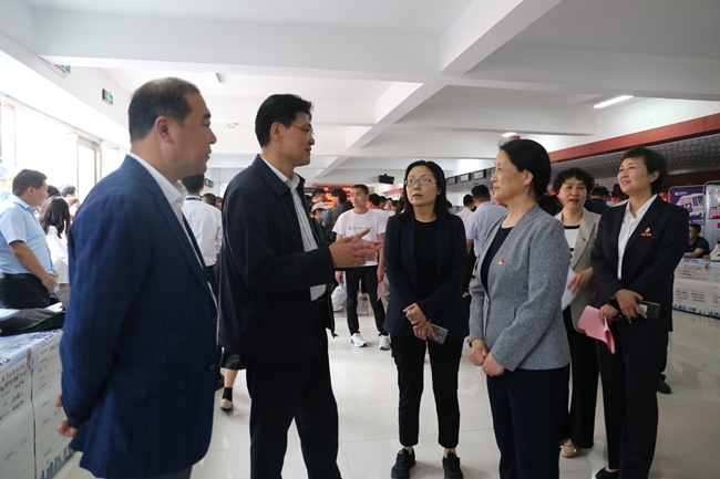 校领导和嘉宾到招聘会现场与用人单位、毕业生深入交流