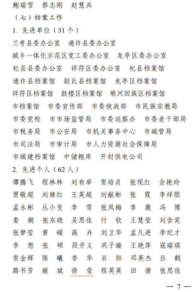 本站讯 近日,从汴档文【2023】10号《关于表扬2022年度全市档案工作先进单位和先进个人的通报》、室文【2023】6号中共开封市委办公室《关于表扬2022年全市党委系统办公室工作先进单位和先进个人的通报》获悉,我校喜获2022年度“全市档案工作综合评价先进单位”“强化政治安全档案工作考核优秀单位”。同时,徐莹、苏瑞老师分别获得“档案工作先进个人”和“综合评价先进个人”荣誉称号。