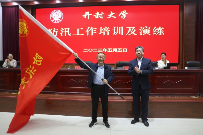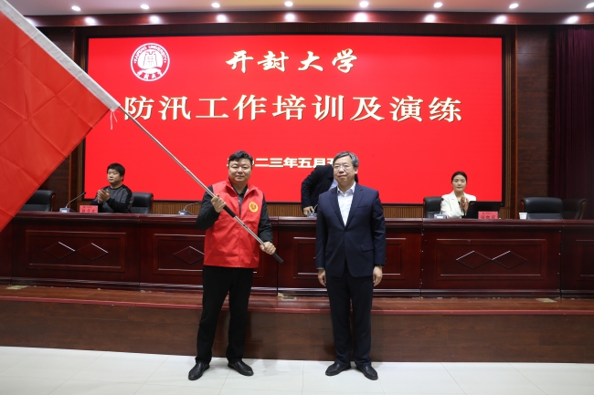 校党政办公室主任陈岩宣读了《bat365在线官方网站防汛应急预案》。宋晓炜为本次防汛培训及应急演练进行动员并提出三点要求:一是准备,要未雨绸缪、防患未然,时刻保持防汛临战状态。二是短板,要关注短板和问题,补齐短板,抓细抓实防汛各项措施。三是责任,要压实责任、严明纪律,切实筑牢防汛责任防线。随后,宋晓炜分别为我校防汛抢险突击总队和3个防汛抢险突击队授旗,总队队长李治、1队队长袁震、2队队长王磊、3队队长徐纪珂分别接旗。