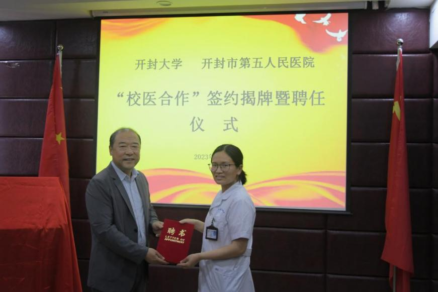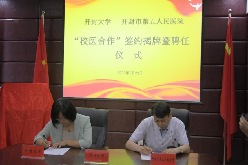 本站讯 5月23日上午,我校与开封市第五人民医院(以下简称“市五院”)“校医合作”签约揭牌暨聘任仪式在市五院举行。市五院党委书记李志献、院长王年喜、工会主席刘树林、纪委书记陈金红、副院长王成柱、相关科室负责人及聘任专家代表,我校党委副书记储建新,学生工作部、心理健康教育中心相关负责人,心理健康教育专兼职教师代表出席签约揭牌暨聘任仪式,仪式由王年喜主持。