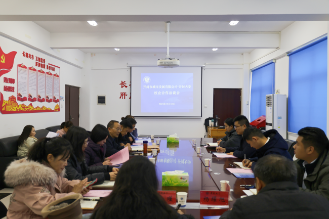 本站讯  12月13日下午,我校与开封市城市发展集团有限公司举行校企合作洽谈会。副校长李治、开封市城市发展集团有限公司副总经理束策目等一行四人出席会议,教务处、就业与校企合作处、土木建筑工程学院、材料与化学工程院、财政经济学院、艺术设计学院、人文学院负责人参加会谈。会议由就业与校企合作处处长师兆忠主持。