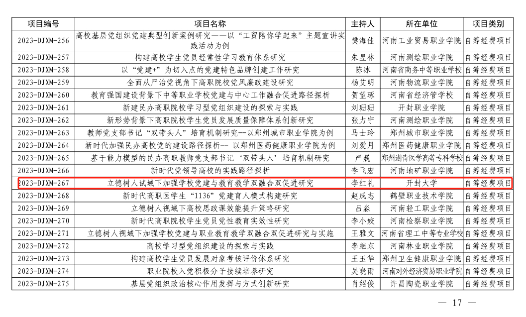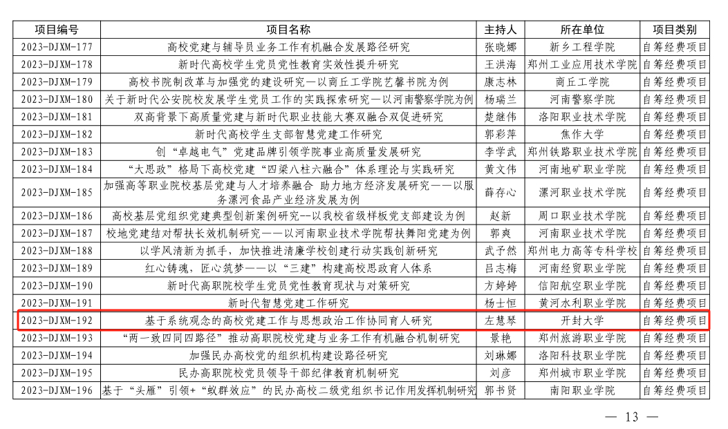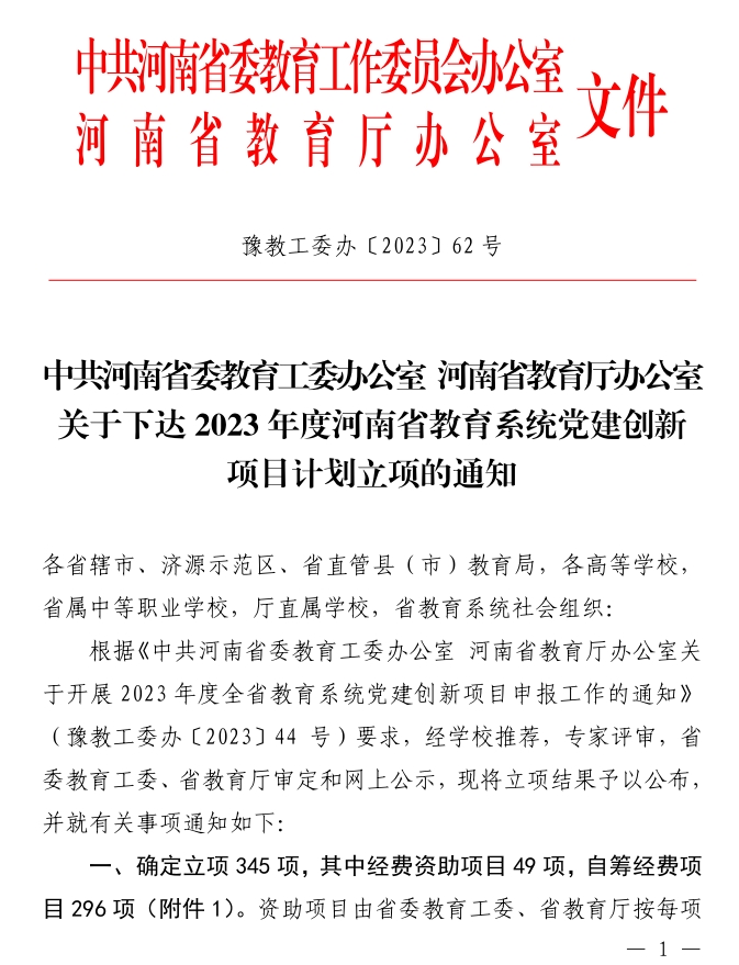 本站讯  近日,省委教育工委、教育厅下发了《关于下达2023年度河南省教育系统党建创新项目计划立项的通知》,我校马克思主义学院副院长左慧琴主持的《基于系统观念的高校党建工作与思想政治工作协同育人研究》、信息工程学院党总支副书记李红礼主持的《立德树人视域下加强学校党建与教育教学双融合双促进研究》2个项目获批立项。