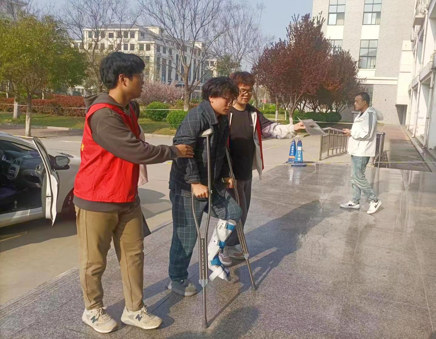 早晨8点左右,考生们陆续进入校园前往考场,正在执勤的安保人员发现人群中有两名拄着拐杖的考生,行走非常缓慢。经了解得知,两名考生在考前因意外受伤造成骨折,只能打石膏拄拐杖前往考场。为了确保考生能够及时安全的进入考场,安保人员立即用巡逻车将两名考生送至15号楼下。提前在15号楼前等候的老师和学生志愿者搀扶着考生通过安检,并一直护送两名考生顺利进入考场。志愿者们进行了暖心的叮嘱,“你们安心的考试,我们就在外边,考完之后来接你们!”
