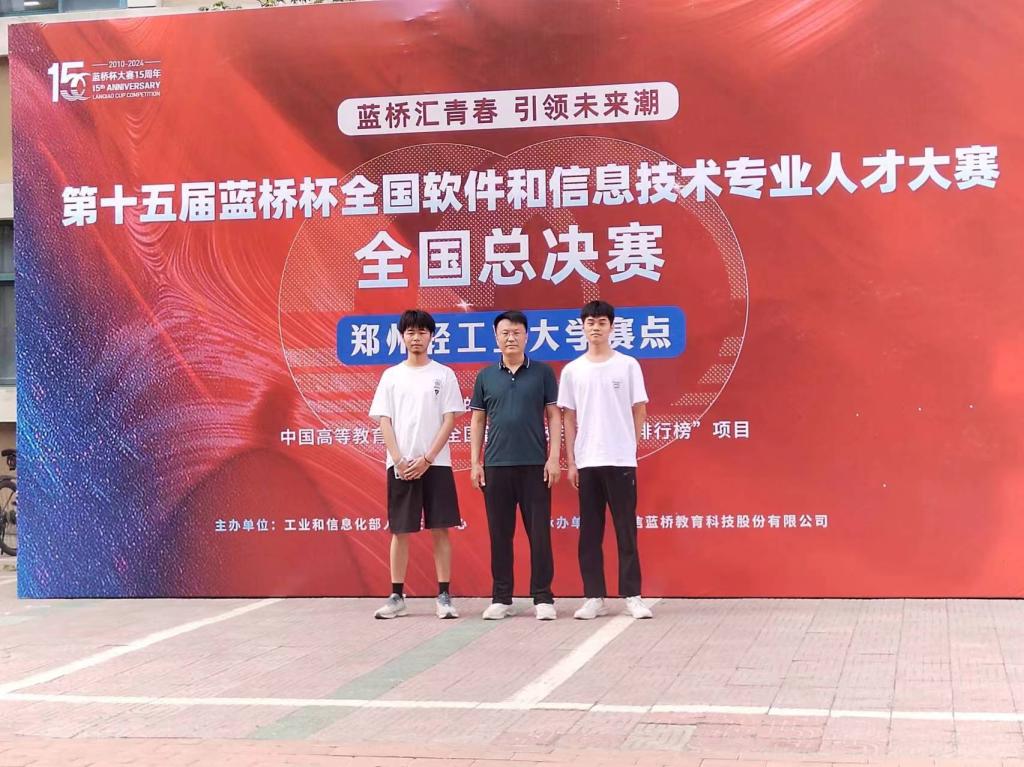 本站讯 近日,由工业和信息化部人才交流中心主办的第十五届“蓝桥杯”全国软件和信息技术专业人才大赛全国总决赛在郑州轻工业大学落下帷幕。由我校信息工程学院张书贵老师指导的台翔超成、刘首富两位同学均获得个人赛二等奖,创下了我校学子在该项赛事中的最高记录。