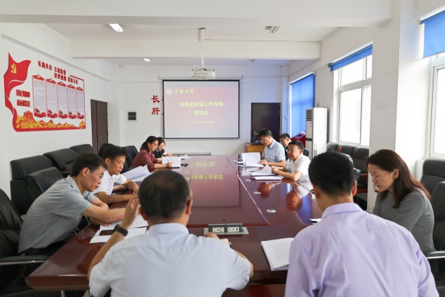 本站讯 6月14日上午,我校在行政楼第四会议室召开高质量发展工作专班座谈会,副校长万是明出席会议,各专班牵头单位负责人参加会议。会议由发展规划处处长叶飞主持。