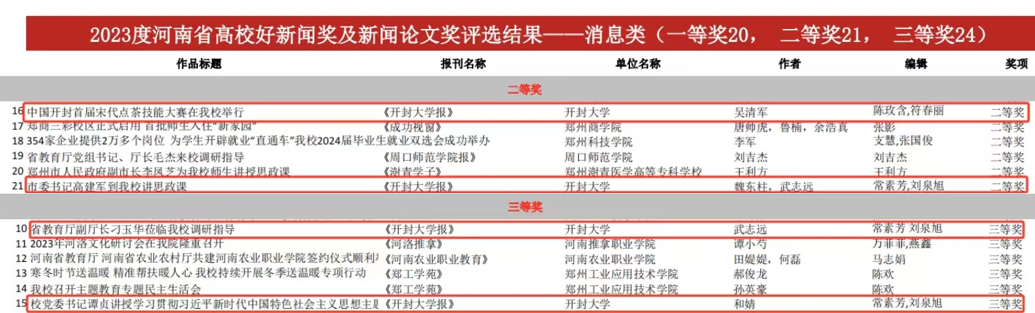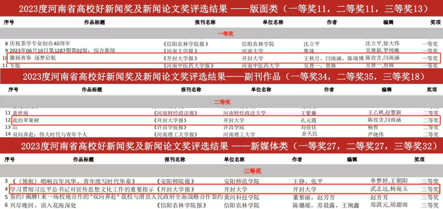 本站讯 本站讯 近日,由河南省高校校报研究会和河南省新闻工作者协会高校报委员会举办的“2023年度河南省高校好新闻奖及新闻论文奖”评选结果揭晓,我校报送作品荣获一等奖1项,二等奖3项,三等奖3项,获奖作品涵盖消息、版面、副刊、新媒体等多个类别。