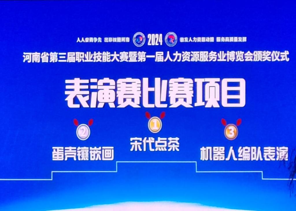 本站讯 9月28日,河南省第三届职业技能大赛暨第一届人力资源服务业博览会在开封落幕。经过激烈的角逐,我校文化与旅游学院王东老师带领学生参加的表演赛项目(宋代点茶)获得金牌,实现了我校省级职业技能大赛此类赛项金牌突破。