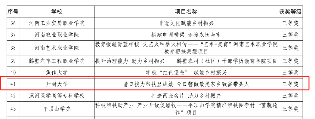 本站讯 近日,河南省教育厅办公室印发了《关于公布2024年河南省高等学校精准帮扶典型项目推选结果的通知》(教办发规〔2024〕301号),我校选送的《昔日接力帮扶显成效,今日誓做最美家乡致富带头人》项目荣获精准帮扶典型项目三等奖。全省共有60个典型项目在此次推选中获奖。