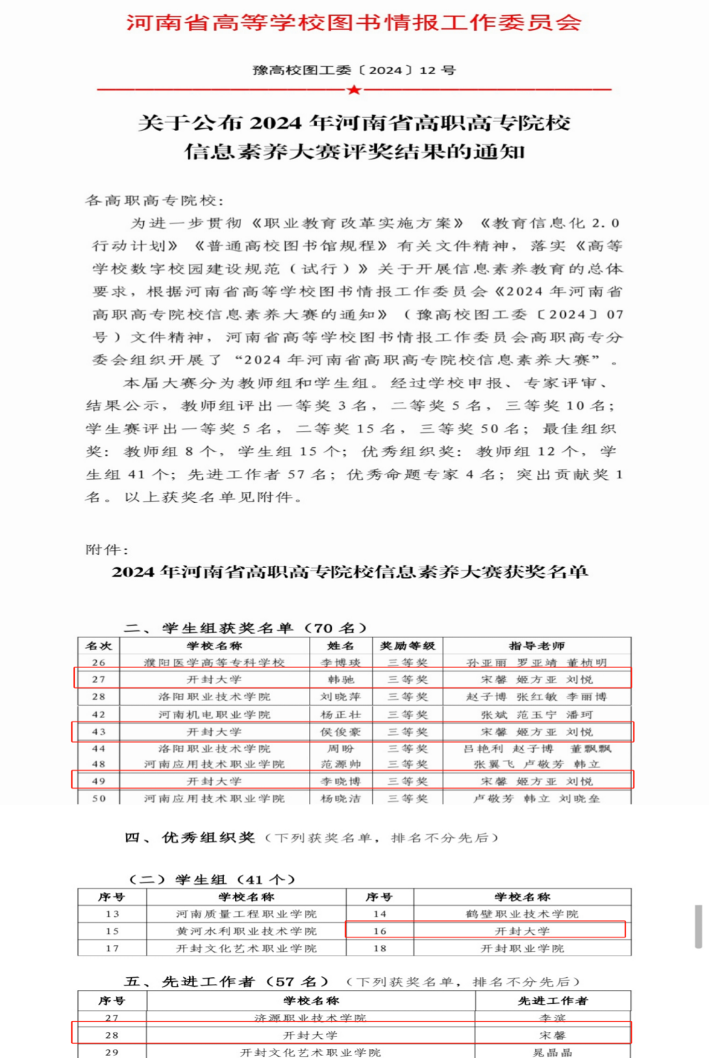 近日,河南省高等学校图书情报工作委员会公布了2024年河南省高职高专院校信息素养大赛评奖结果,bat365在线官方网站荣获“优秀组织奖”称号,宋馨、姬方亚、刘悦3位教师获得“优秀指导教师奖”,宋馨获得“先进工作者”称号。