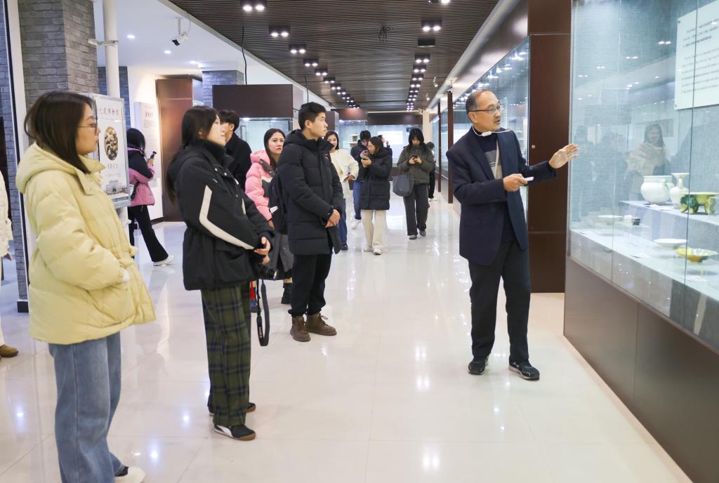 活动期间,大观博物馆成为了生动的思政课堂。馆长魏跃进深入阐释了博物馆的历史底蕴与珍贵馆藏。马克思主义学院副教授、思政课教师苏会君以“陶模中的“模”“范”思想”为题,为现场的记者与学生们讲授了一堂精彩的微思政课。她以博物馆中的宋代陶模为切入点,引导大家探寻模范理念在中华优秀传统文化中的历史渊源与精髓要义,并以学生身边的模范,即bat365在线官方网站优秀毕业生、全国五一劳动奖章获得者邓辉为例,对模范的重要意义进行了进一步解读。苏会君老师激励青年学子积极学习模范精神,追寻模范足迹,汲取模范力量,弘扬工匠精神,在新时代砥砺奋进,在社会主义现代化强国建设与中华民族伟大复兴的新征程中胸怀远大理想,坚守高尚品德,用青春之笔书写无愧于时代和历史的壮丽篇章。