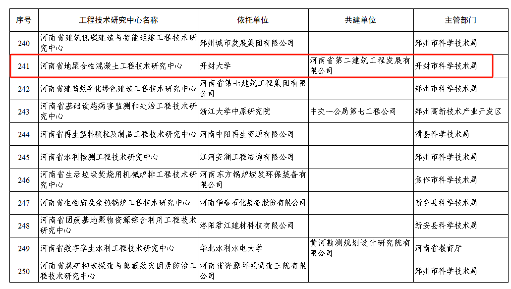 本站讯 近日,河南省科学技术厅下发了《关于认定建设2024年度河南省工程技术研究中心的通知》(豫科实〔2025〕1号),对2024年度河南省工程技术研究中心名单进行了公布。我校组织申报的“河南省地聚合物混凝土工程技术研究中心”获批立项建设。