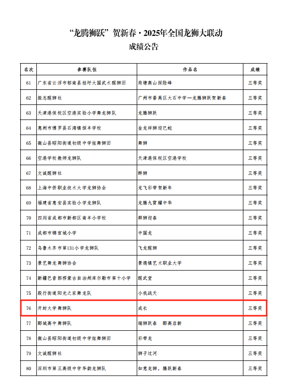 近日,在中国龙狮运动协会“龙腾狮跃”贺新春·2025中国龙狮大联动活动中,我校舞狮社团的参赛作品《成长》荣获三等奖。