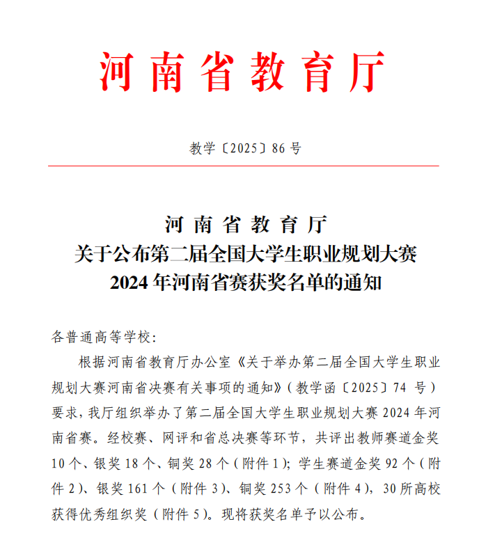 本站讯 近日,河南省教育厅公布了第二届全国大学生职业规划大赛2024年河南省赛获奖名单。我校智能制造学院张元耀同学荣获成长赛道职教组铜奖,艺术设计学院寇茵、医学院张一湦同学荣获就业赛道职教组铜奖。