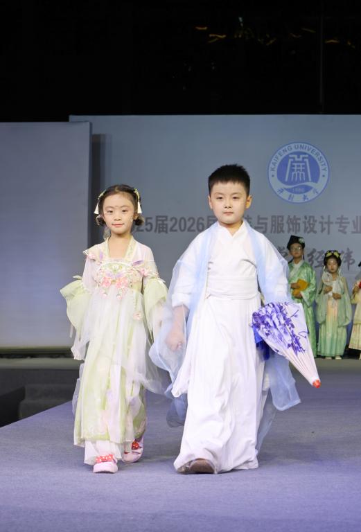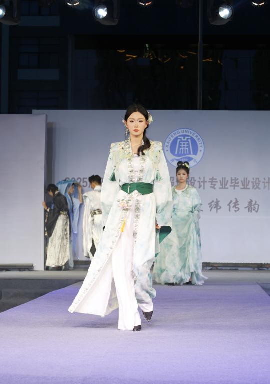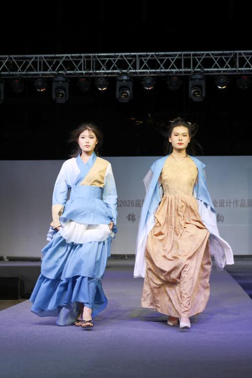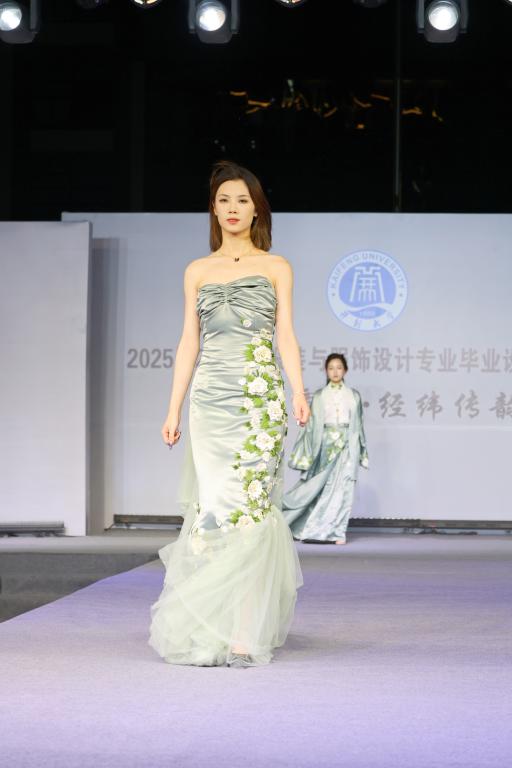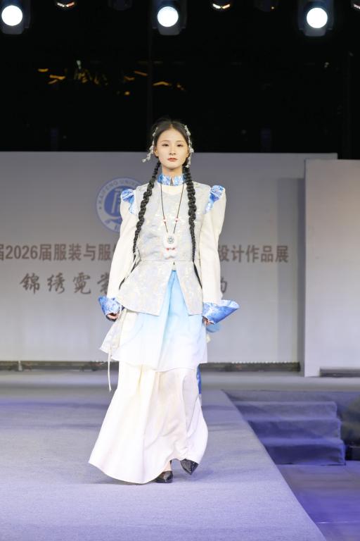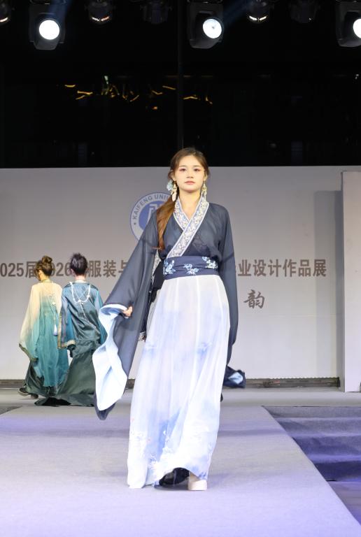 本次展演分为逍遥游、苗乡藏韵、礼服流光、幻衣狂想、宋韵雅集五大主题。从主题构思到面料选择,从打版剪裁到成衣制作,全程由学生主导完成。部分作品来源于校企合作实地生产项目,并结合地方文化特色,融入了刺绣非遗技艺。创作者们用经纬线编织的不仅是华服美裳,更是对“文明厚度与艺术温度”的独特理解,作品在传承文化根脉的同时,又体现了创新思维与跨界融合。