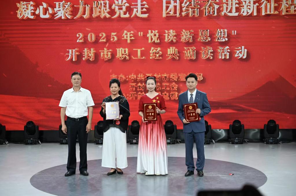 本站讯 7月1日上午,由开封市委宣传部、市总工会主办的“悦读新思想”开封市职工经典诵读活动在开封市广播电视台落下帷幕。我校参赛选手凭借出色表现,从众多参赛队伍中脱颖而出进入决赛,取得优异成绩。