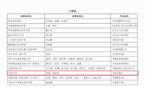 本站讯 近日,河南省教育厅官网公布第七届中华经典诵写讲大赛(河南赛区)“诵读中国”经典诵读大赛评选结果,我校教师陈玫含、徐喆完成的作品《读中国》获得教师组三等奖。