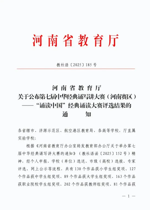 本次活动由河南省教育厅主办,以“典耀中华,赓续文脉”为主题,旨在通过经典作品诵读,弘扬中华优秀文化,让传统文化滋养心灵、薪火相传。自赛事启动以来,学校高度重视,相关部门通力协助,有序推进参赛人员选拔、诵读篇目筛选、参赛作品排练及视频录制等各项工作。备赛期间,参赛教师深度挖掘中华经典的丰富内涵,不断提升文化品位和文学素养,最终凭借扎实的功底斩获佳绩。