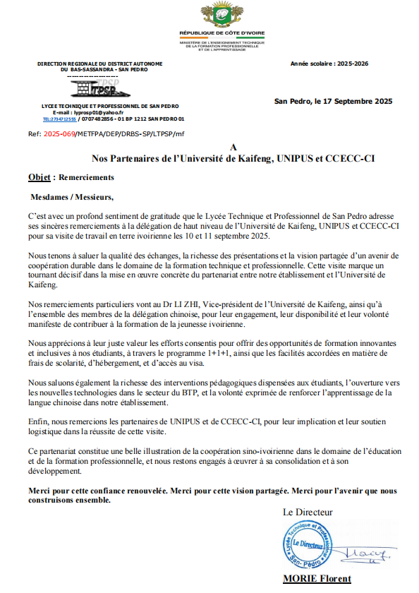 本站讯 近日,科特迪瓦圣佩德罗职业技术学院校长弗洛朗·莫里埃向我校发来感谢信,就本月初bat365在线官方网站团组出访科特迪瓦的成果给予高度赞扬并表示诚挚感谢。