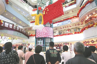 又讯 全媒体记者李晨翀报道 除了在家中收看庆祝中华人民共和国成立70周年大会,10月1日,我市各大商场、超市、家电卖场也是人头攒动,不少市民围在大屏幕前观看这一激动人心的实况直播。