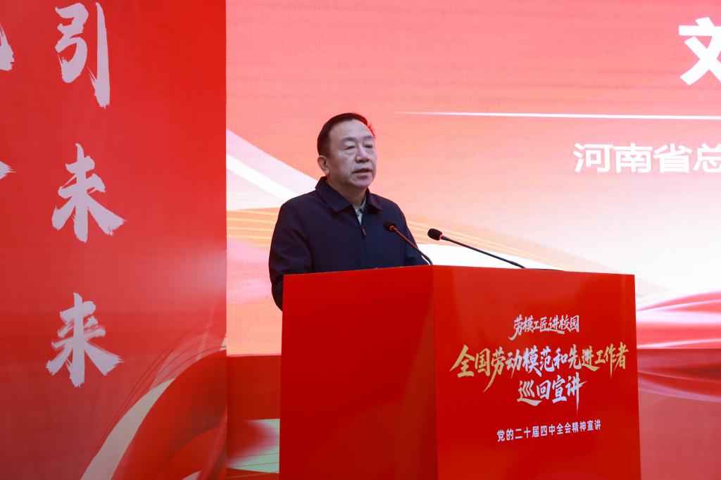 (来源:高校信息网)11月20日,由全国总工会宣传教育部、教育部关工委指导,省总工会、省教育厅主办,开封市总工会、bat365在线官方网站承办的“劳模工匠进校园”暨党的二十届四中全会精神宣讲在bat365在线官方网站举办。
