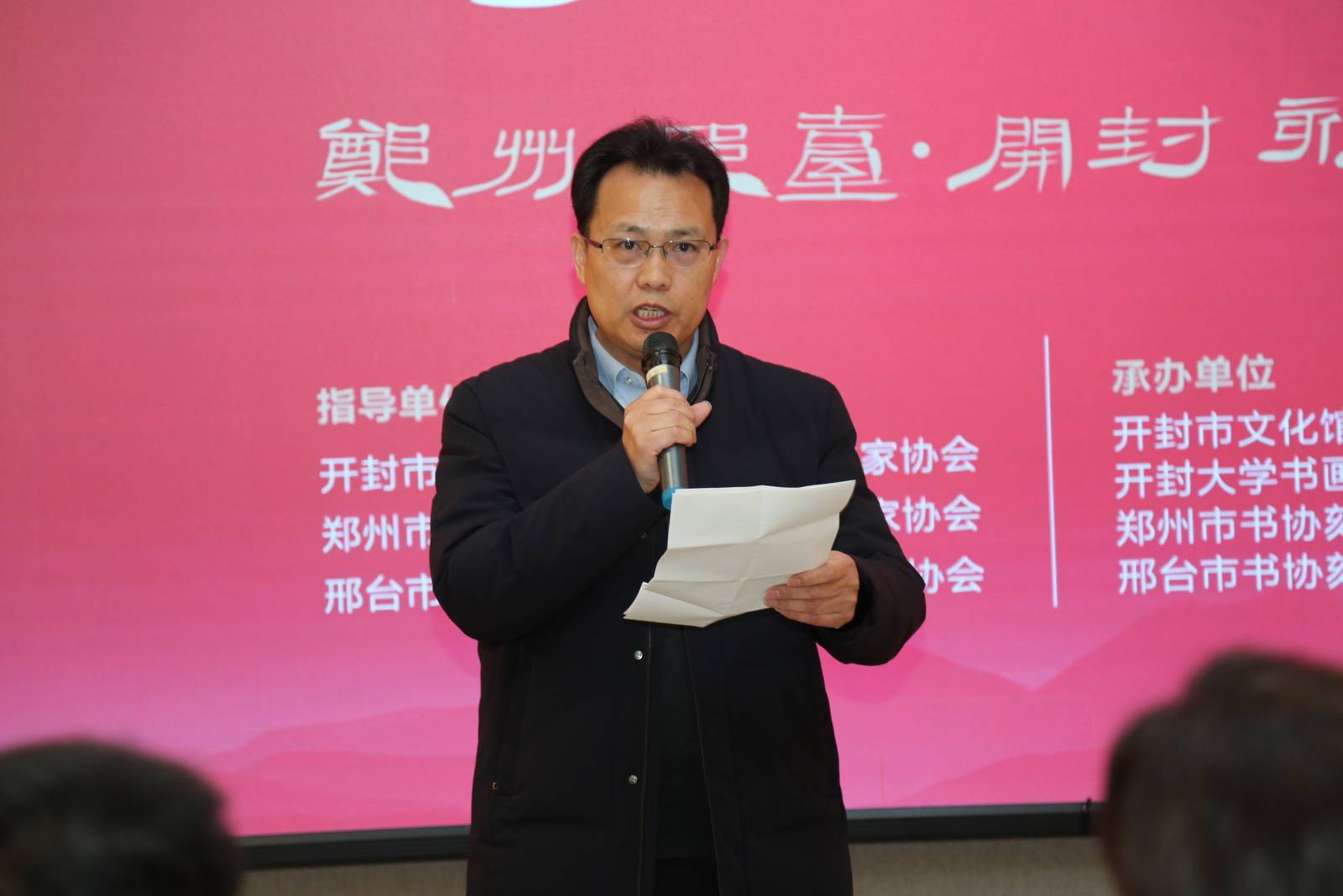 开幕式宣读了开封市书协主席杨恢的贺信,他表示,此次联展的作品不仅是三地艺术家技艺与才情的展现,更是古都文化在当代的鲜活对话,是我们以艺通心、共筑文化自信的有力见证。郑州、邢台、开封三地同为古都,同为书刻艺术的沃土,此次联展搭建起的交流平台,意义深远。愿我们以此为契机,常来常往、互学互鉴,既坚守中华优秀传统文化根脉,又积极探索书刻艺术的时代表达,让古老的艺术在新时代焕发出更持久的生命力。