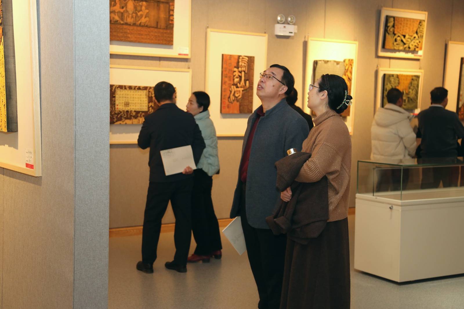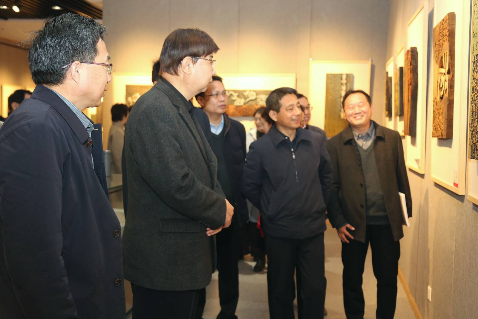 此次展览共展出三地艺术家精心创作的刻字精品105件,作品布局巧妙、匠心独运,刀工娴熟、凹凸有致,以中国书法为核心,融合了传统刻字、篆刻、绘画、版画等元素,兼具平面构成、立体构成与色彩构成三大特征,通过刀法表现与材料肌理的结合,形成了立体化视觉语言,让观众充分感受到了文字形态抽象变形与多维呈现的综合艺术之美。 开幕式结束后,参加开幕式的领导、嘉宾和大家一道,到展厅观赏展品,并合影留念。
