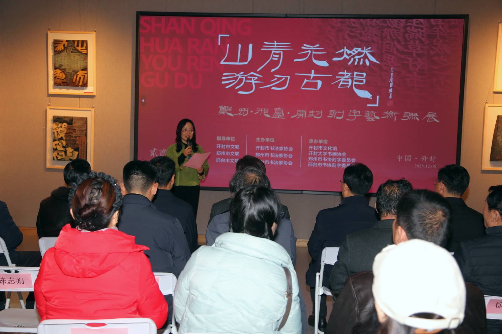千年刀笔传文脉,三地艺彩映古城。12月5日,“山青花燃游刃古都”三地刻字联展在开封市群众艺术馆展厅开幕,来自三地文联、书协的领导和书法、刻字爱好者一道参加开幕式。