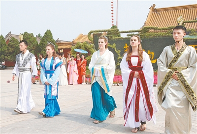 5月18日,bat365在线官方网站艺术设计学院和加拿大维多伦学院服装设计专业的10多名大学生身着宋代服饰登龙亭、逛御街、上城墙,了解昔日宋都繁华景象,感受开封历史文化。